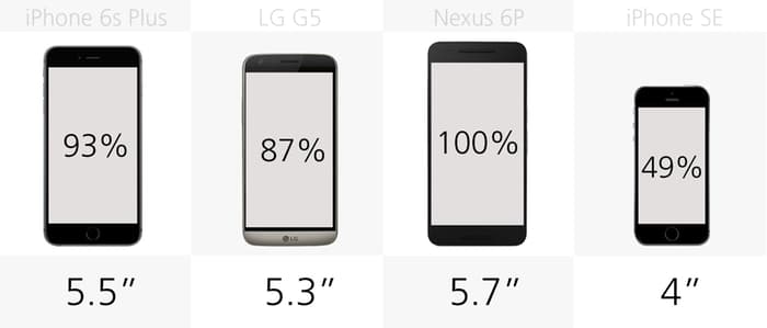 Nexus 6P are ecranul cel mai mare din acest grup, mai mult decât dublu decât cel mai mic, același iPhone SE.